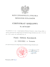 Biuro Rachunkowe KA-EL funkcjonuje na rynku od 2008r. na podstawie Certyfikatu Księgowego nr 18739/2007 wydanego przez Ministra Finansów.
